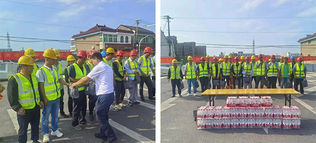 項目現(xiàn)場,張志軍詳細了解了項目作息時間、現(xiàn)場防暑降溫物資配備、高溫作業(yè)防護和安全生產(chǎn)措施等情況,并為每位施工人員分發(fā)了豐富的“清涼禮包”,包括礦泉水、藿香正氣水、人丹等一系列防暑降溫物品,承載著對工人健康與安全的深切關懷。他強調,當下正值高溫酷暑時期,各項目部要統(tǒng)籌做好各項安全生產(chǎn)工作,重點抓好高溫天氣的防暑降溫、安全防護措施和應急處置等工作,合理安排作業(yè)時間,切實維護施工人員的職業(yè)安全和健康。